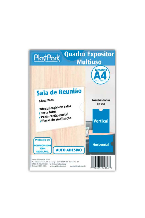 Descrição complementar - O Quadro Expositor Multiuso em PP PLAST PARK é produzido com material 100% reciclável. Com aplicação auto adesiva é ideal para identificação de salas, sinalização em geral e quadro de avisos.