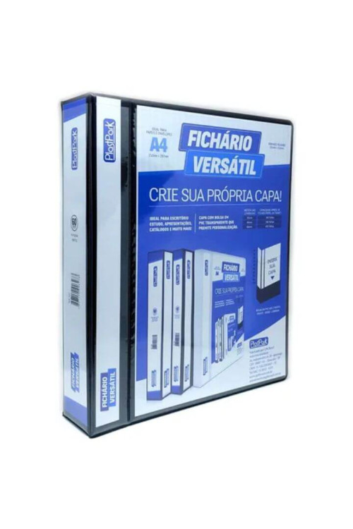 Descrição complementar - O Fichário Versátil PLAST PARK, possui capa, contra-capa e dorso em PVC cristal, permitindo a total personalização do seu fichário. Ideal para organização, manual de procedimentos, estudo, apresentações e catálogos. Possui reforço no dorso para maior mobilidade e durabilidade do produto.